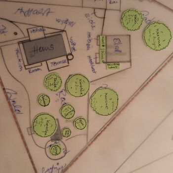 mit Integrierung des bestehenden Gemüsegartens, Berücksichtigung der im B-Plan geforderten Bäume und der Planung eines 3-Zonen-Gartens nach Markus Gastl. Dazu gehören Gehölze mit essbaren Früchten, Windschutz durch eine Hecke aus möglichst heimischen Gewächsen, die zu jeder Jahreszeit Blüten trägt sowie eine Blumenwiese mit hoher biologischer Vielfalt als pflegeleichte Komponente. Die Umsetzung erfolgt in Teilschritten.